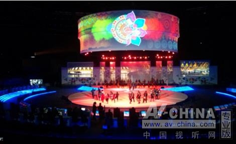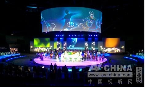 組辦方委派Modern Stage Service為大會打造投影燈光映射,投影區域包括直徑21.3米的圓形主地面的中央、兩個直徑分別為20.7米和20.1米的懸掛式大型圓柱形屏幕,以及由多個大小不同的屏幕構成的舞臺背景。