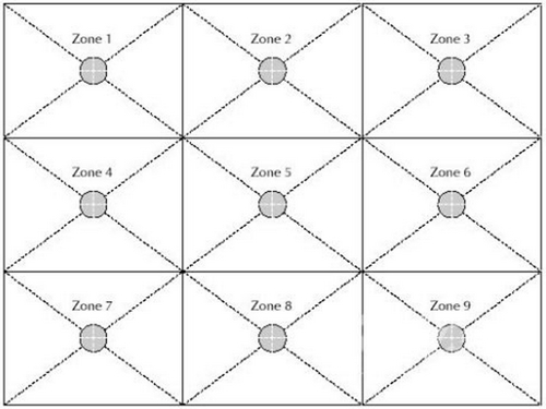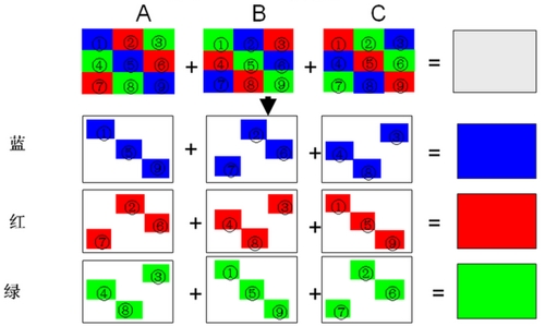 (①+②+③+④+⑤+⑥+⑦+⑧+⑨)/9(A畫面流明)+(①+②+③+④+⑤+⑥+⑦+⑧+⑨)/9(B畫面流明)+(①+②+③+④+⑤+⑥+⑦+⑧+⑨)/9(C畫面流明)=色彩流明(色彩亮度)。