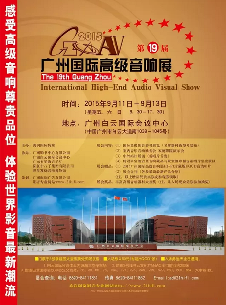 消息,廣州第19屆國際高級音響展將于9月11日—9月13日在廣州白云國際會議中心舉行。屆時,將有國際高級影音器材展覽,室內音樂音響欣賞會,中外唱片展銷等精彩活動。