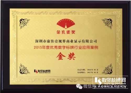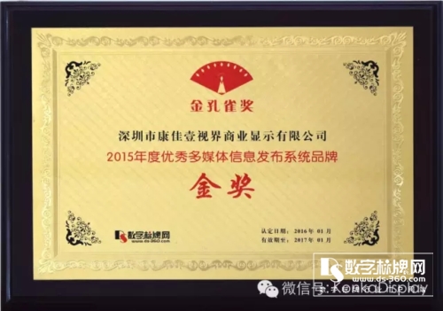 而數字標牌行業2015年度行業最高榮譽獎項—“金孔雀金獎”——《優秀多媒體信息發布系統品牌金獎》《優秀數字標牌行業應用案例金獎》,兩度花落康佳壹視界商顯,不僅是對康佳壹視界取得成績的鼓勵,更是對康佳壹視界互聯網+戰略的高度認可!