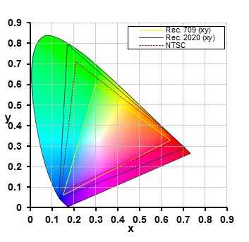一個畫面準確一致地再現(xiàn)另一個畫面中的某種顏色,就需要定量測量。這是色域概念開始發(fā)揮作用的地方。色域表示給定系統(tǒng)可以產(chǎn)生的所有不同顏色。不同的色域標準(如國際電信聯(lián)盟建議(ITU-R)的Rec.709Rec.2020,國家電視系統(tǒng)委員會(NTSC))定義了不同數(shù)量的色譜,可通過復制以達到兼容。這些標準為每種顏色分配了其專屬的顏色坐標,并確保在一個畫面復制的顏色在另一臺顯示上看起來完全相同。每個標準定義的色域在XY色度圖上顯示為三角形,如圖3所示。這些三角形顯示了由直線連接的峰值紅--藍(RGB)坐標。