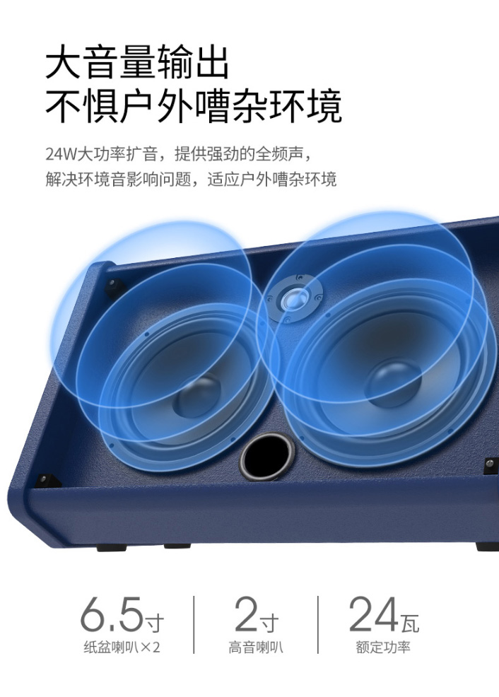 OPS-25可輸出24W大功率音量,聲音清晰有力、穿透力強(qiáng)、音質(zhì)美妙,是由內(nèi)置的兩個6.5寸高性能紙盆揚(yáng)聲器提供強(qiáng)勁的全頻聲,內(nèi)置的2寸高音喇叭豐盈聲音細(xì)節(jié),音箱表現(xiàn)聲音豐富有感染力。