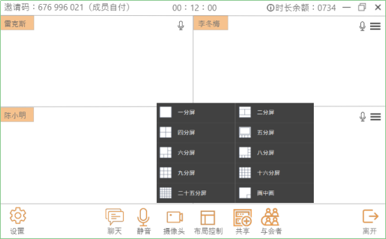布局控制功能。用于控制視頻會(huì)議中視頻流的展示方式,提高會(huì)議的溝通與交流;布局方式包括“一、二、四、五、六、八、九、十六、二十五分屏及畫中畫”