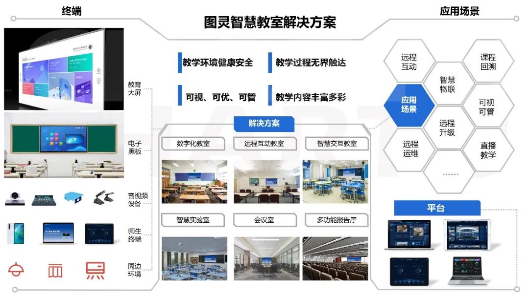 圖靈集成教學系統(tǒng)、LED顯示系統(tǒng)、人員考勤系統(tǒng)資產(chǎn)管理系統(tǒng)、燈光控制系統(tǒng)、空調(diào)控制系統(tǒng)、門窗監(jiān)視系統(tǒng)、通風換氣系統(tǒng)、視頻監(jiān)控系統(tǒng)。針對不同時間,不同場景對室內(nèi)溫度等進行調(diào)控,通過傳感器及煙霧報警器,實現(xiàn)對溫度、濕度、PM2.5、二氧化碳、甲醛、照度及煙霧的感知調(diào)控,為師生提供健康空間。