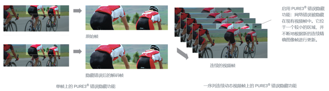 對網(wǎng)絡(luò)錯誤高度免疫,確?煽康貍鬏敻咂焚|(zhì)的圖像,甚至能在大量丟包的情況下隱藏錯誤。解碼器保留了前面幀的圖像數(shù)據(jù),以便在丟包時使用。當(dāng)發(fā)生數(shù)據(jù)包錯誤時,就會顯示該數(shù)據(jù),從而隱藏丟失信息。同時,PURE3 錯誤糾正并不像其它廠家那樣要靠增加延遲或?qū)嵤?FEC - 前向糾錯等手段來完成。