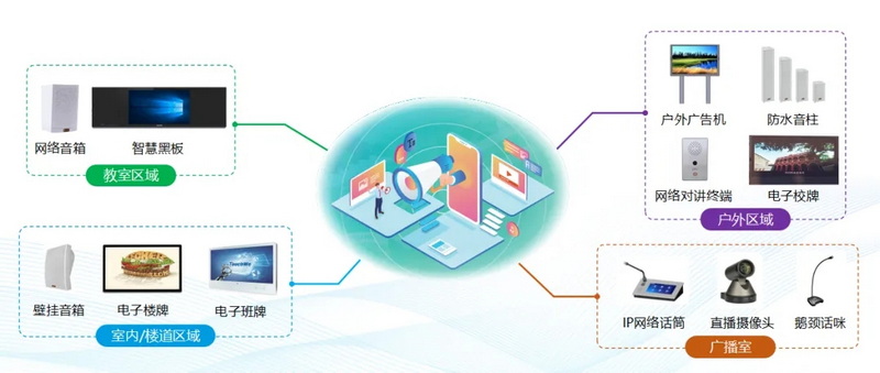 信息廣播中心是智慧校園信息數(shù)據(jù)管理指揮中心的校園信息廣播子平臺(tái)。通過信息廣播中心,管理人員可便捷地掌握校園各區(qū)域、各廣播終端的分布及廣播現(xiàn)狀,可實(shí)現(xiàn)校園廣播、校園通知等的快速發(fā)布,同時(shí)提供相關(guān)信息廣播系統(tǒng)的便捷入口,實(shí)現(xiàn)了業(yè)務(wù)的快速切換,形成校園廣播信息數(shù)據(jù)一體化,確保了各廣播消息的觸達(dá)時(shí)效及覆蓋區(qū)域。